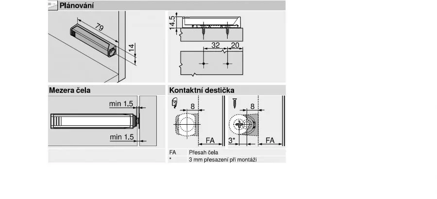 Montáž s pomocí vrutu do dřevotřísky pr. 3.5 mm a/nebo pr. 4 mm nebo s pomocí eurošroubu .