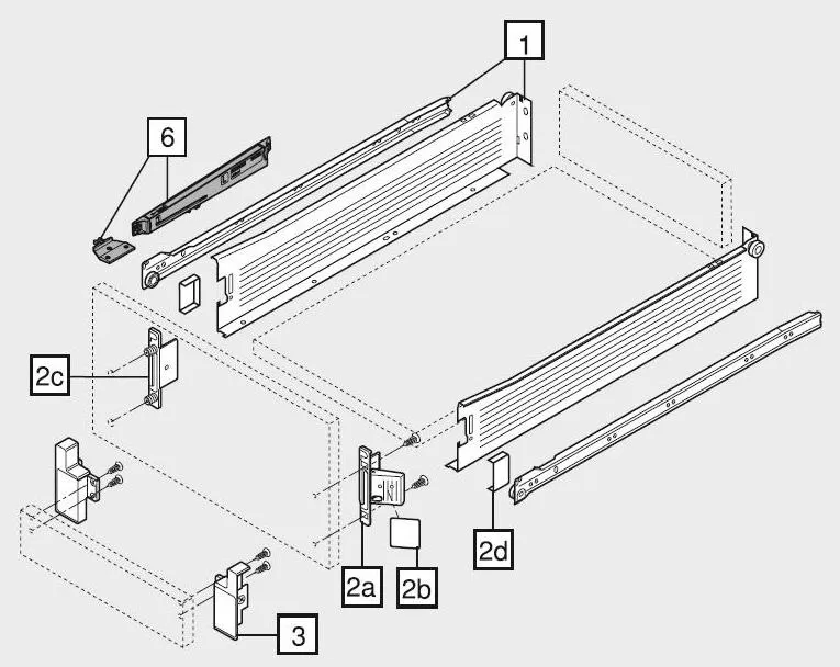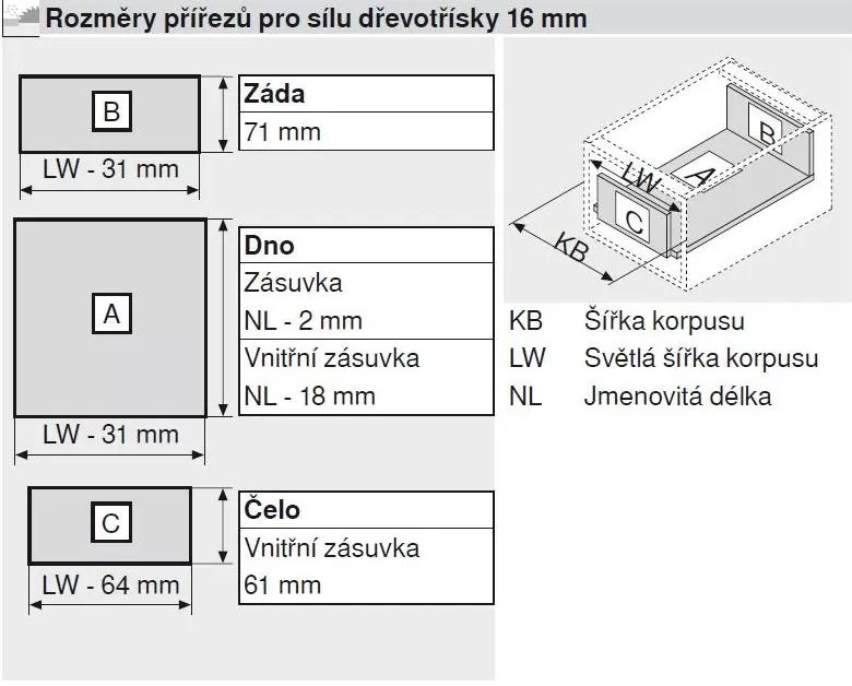 Sada obsahuje: částečný výsuv L+P, ocelové bočnice L+P, čelní příchyt na vrut L+P,