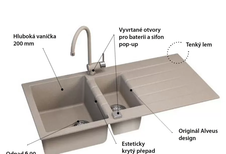součásti dodávky: sifon pop-up s přepadem a odbočkou na myčku, excentrické ovládání výpustě, úchytky pro uchycení k desce