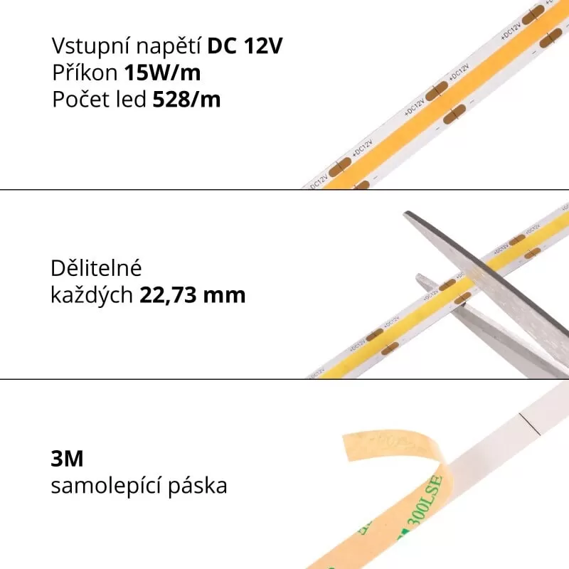 Řada LED pásku COB je speciální řada LED pásků, kde jsou LED čipy zalité vrstvou luminoforu, které způsobuje stejnoměrné svícení LED pásku bez viditelnosti jednotlivých diod. LED pásek COB tedy můžete použít například i u instalací, kde není možné použít dostatečné vhodný profil s mléčným krytem, který standardně světlo z LED pásku může sjednotit do jedné linie. Zalití luminoforem také zvětšuje úhel svitu COB LED pásků na 180°.