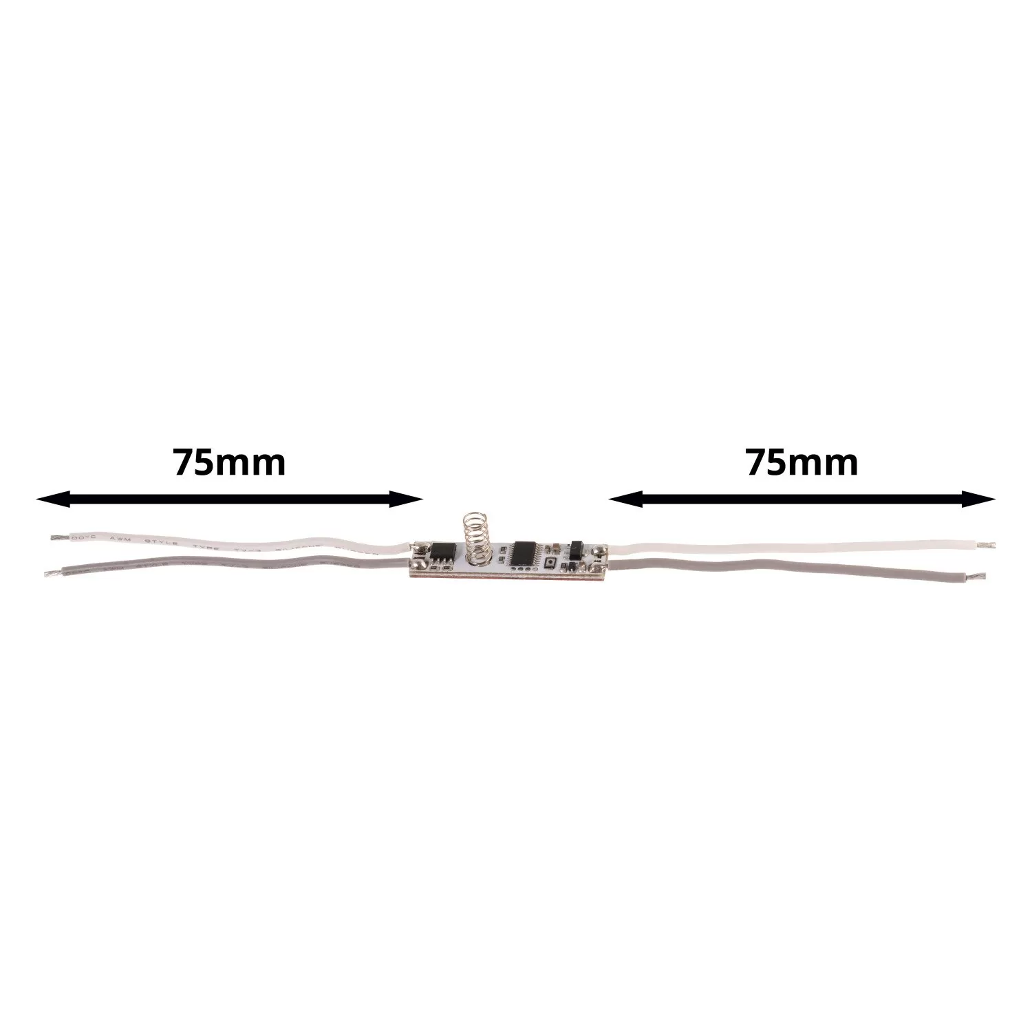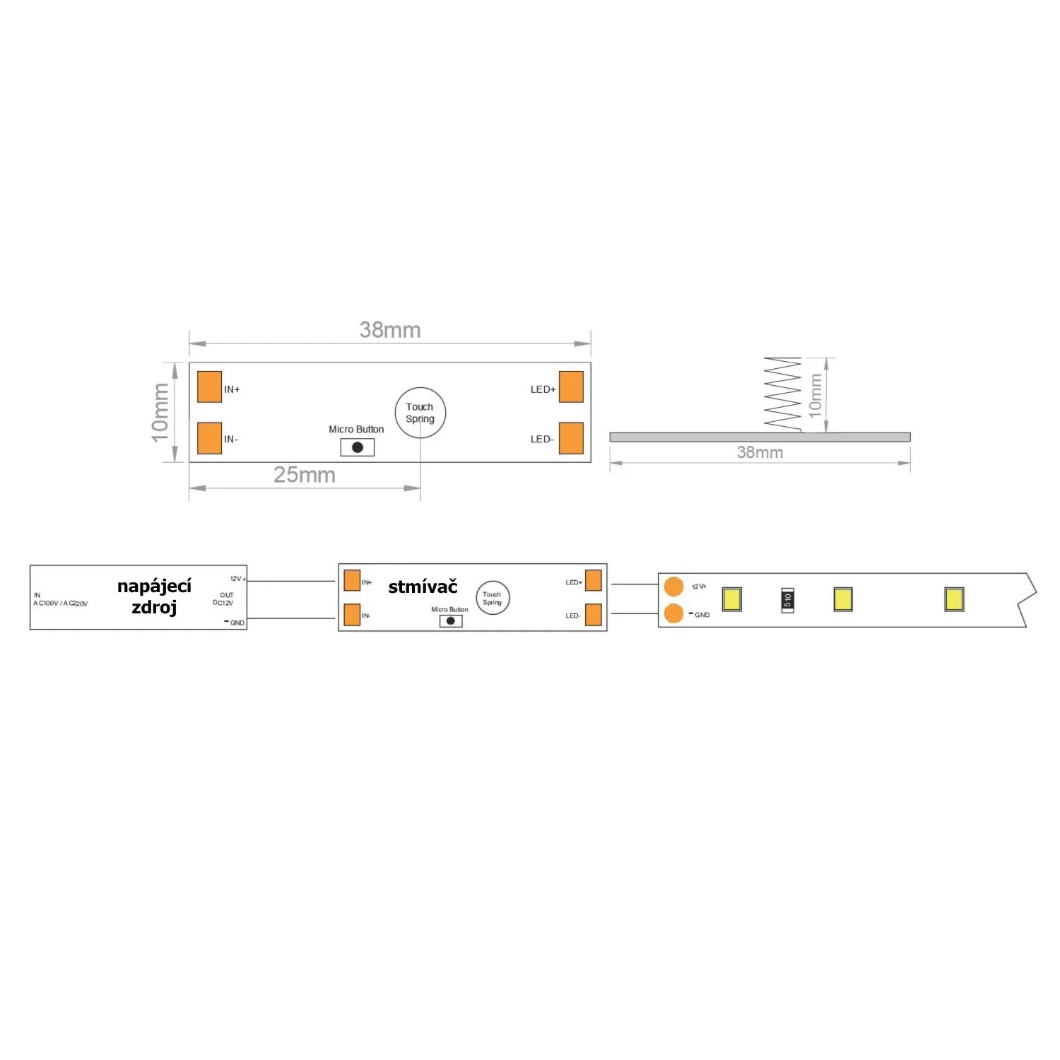 Miniaturní stmívač určený k instalaci do ALU profilů pro LED pásky. Funkce postupného náběhu světla šetří oči, po přerušení napájení na vstupu zdroj (trafa) je stmívač v pozici vypnuto. Pro snadnou orientaci místa dotyku senzoru je vybaven modrou LED kontrolkou.
