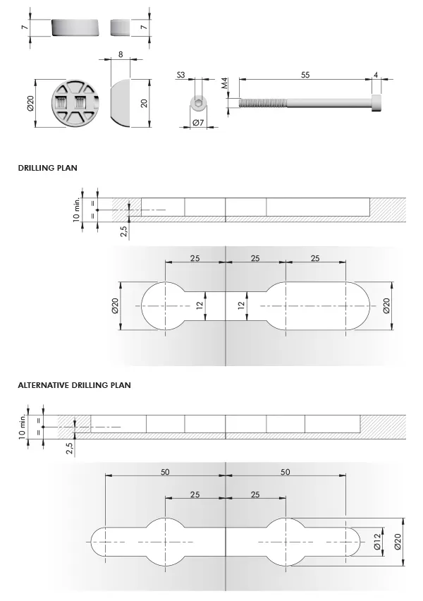 Svorníky pro spojování kompaktních desek v minimální tloušťce 10mm.
