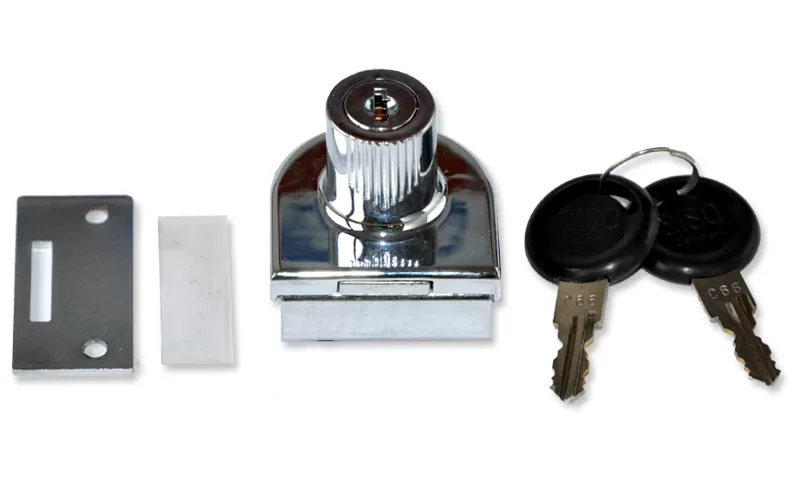 Zámek slouží k uzamykání jednoho křídla skleněných dveří do půdy nebo dna korpusu bez nutnosti vrtání otvoru do skla.