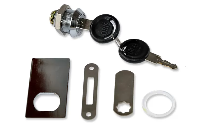 zámek, přední krycí plech, 2ks klíče, jazýček, převlečná matice, tlumící kroužek, protiplech s výřezem