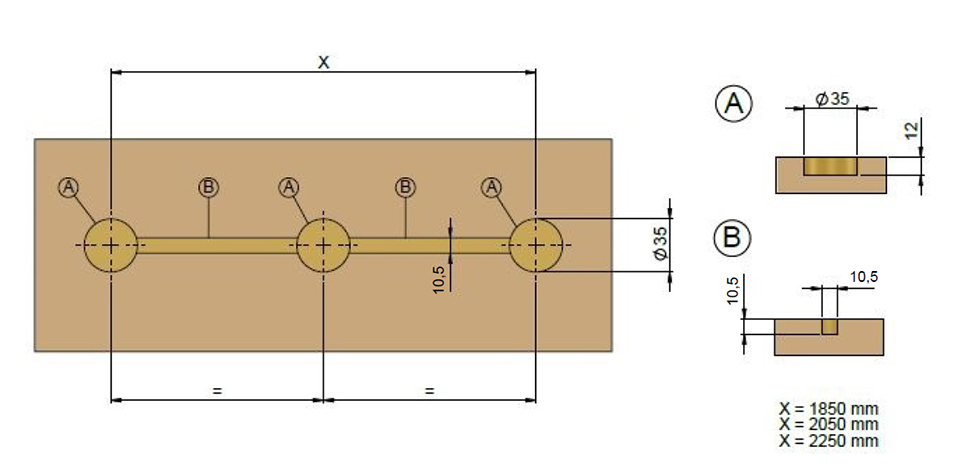 Hloubka drážky 10mm, šíře 10mm, ukončení průměr 35mm, hloubka 12mm.